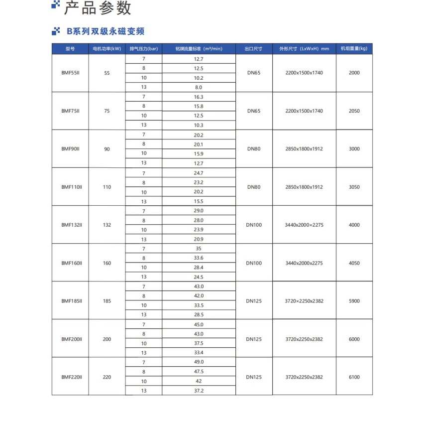 | BMF19-8II | 18.5 | 8 | 3.63 | 永磁变频 | G1 1/2 | 1550x930x1315 | 650 |
