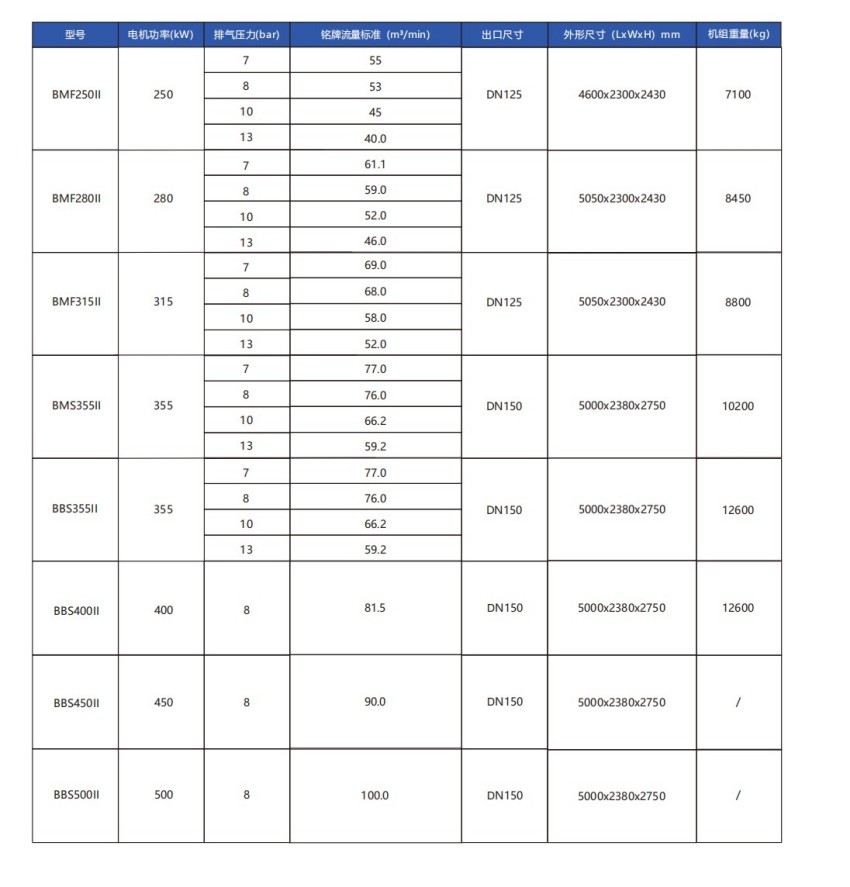 | BBF280-8II | 280 | 8 | 58 | 异步变频 | DN125 | 5050x2300x2430 | 9700 |