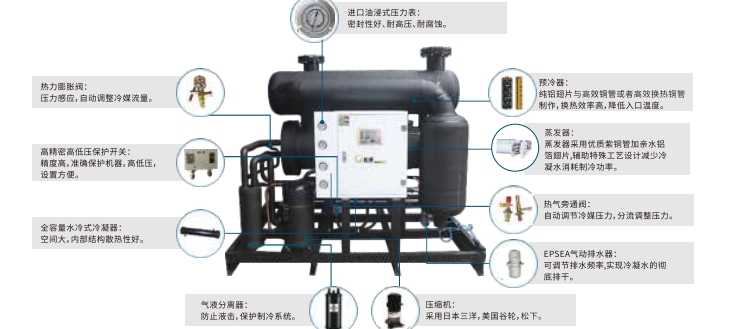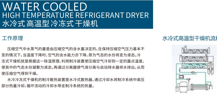 4、若水冷式干燥机所使用的冷却水质较差,应在冷却水入口处加装水过滤器。同时,应确保冷却水温度维持在10~32℃之间,且水压控制在0.15~0.35 bar范围内。