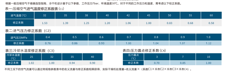 冷冻式干燥机因受冰点,制冷换热效率和气水分离器分离效率限制,能达到的压力露点较高,为2°C~10°C。冷冻式干燥机确实能够容忍更高的进气温度和进气压力,然而,高温环境会明显削弱其干燥效果。因此,在面临较为严苛的工作条件时,选型过程中应适当加大冷冻式干燥机的处理容量,以确保其性能稳定且高效。