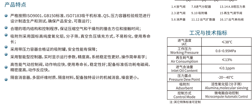 无热再生式干燥机,其工作原理是利用变压吸附和再生循环,通过自热方式进行吸附干燥,无需外部热源。在运行过程中,压缩空气会在两个吸附塔之间交替流经。当其中一个吸附塔处于高分压状态时,干燥剂会吸收大量水分;而另一个吸附塔则通过再生气管道通入干燥的低压气体,从而解析出干燥剂吸收的水分。这种干燥机的优点在于结构简单、维护便捷;然而,其缺点也显而易见,包括耗气量大、能源品位要求高,以及有效供气量相对较小,有时甚至存在露点不够稳定的问题