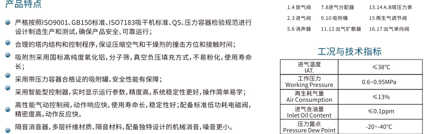 5.在第一个月中,清洗或替换压缩空气管路过滤器的滤芯,并且以后也要定期地更换。清洗排气消声器,如果再生循环中的再生塔压力大于或等于0.035Mpa替换消声器。