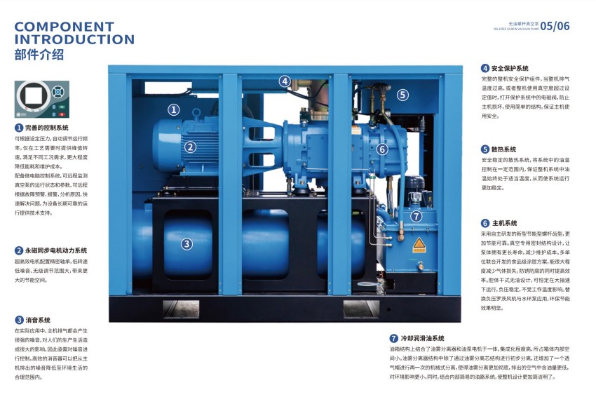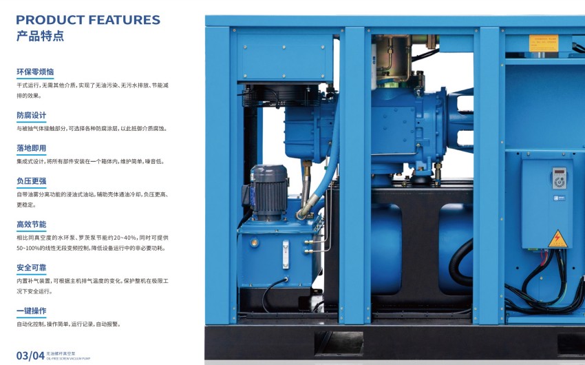 无油螺杆真空泵具有良好的适应性,能够在各种环境下稳定工作。它适用于需要高真空度的场合,如电子行业、制药行业和食品加工等。由于其结构设计合理,可以处理多种气体,包括腐蚀性气体和蒸汽。这使得无油螺杆真空泵在许多行业中都能发挥重要作用。