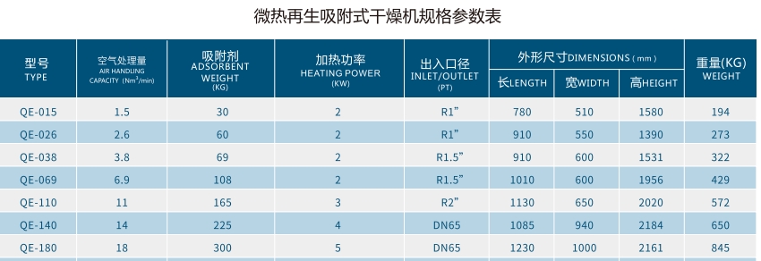 微热再生吸附剂的除湿原理与无热再生基本相同,不同点是它用于再生的低压干燥空气先经过加热再进入再生塔使干燥剂脱湿,在结构上增加了加热装置,在再生程序上增加了加热与冷吹工序。微热再生吸附式干燥机的优势能源浪费少,仅6%。而且切换周期长机件磨损少,提高了设备可靠性。它最终的成品气干燥度比无热再生要好