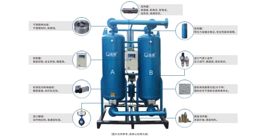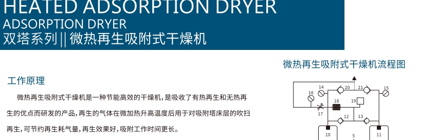 微热再生吸附式干燥机结合了变压吸附和变温吸附的优点,在常温高蒸汽分压下进行吸附工作,而在较高温度、低蒸汽分压下进行解析再生。这样,吸附剂在吸附过程中吸收的水分,在再生过程中能通过高品质再生气(干燥空气加热)的热扩散和低分压机理的共同作用被彻底清除。