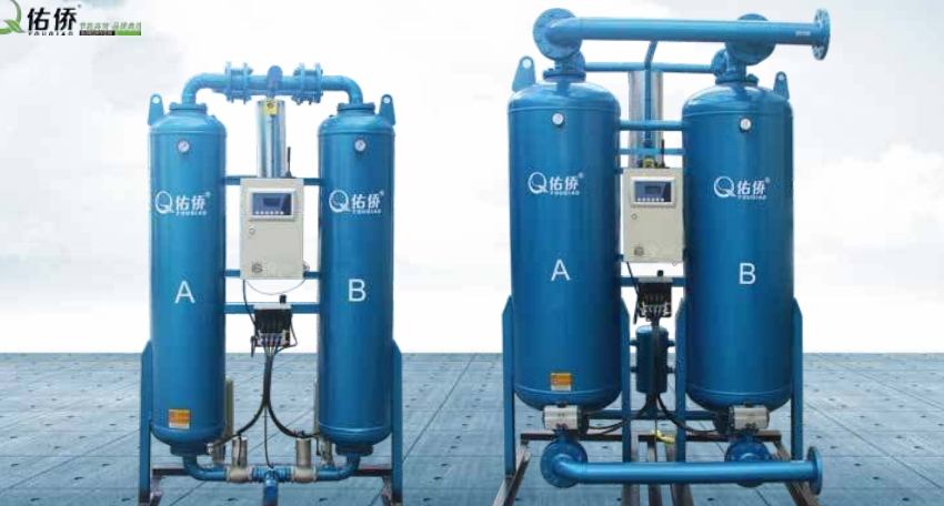 微热再生吸附式干燥机工作流程:吸附-湿空气从下管径经电磁阀进入A干燥筒,自下向上流经吸附剂层,干燥后的压缩空气从上管径排出;再生-部分干燥压缩空气(约7%)通过上管径再生气调节阀后进入加热器加热,这部分热空气进入B干燥筒,自上而下对B干燥筒内的吸附剂解析再生,恢复吸附剂的吸附能力,再生气通过下管径阀门和消声器排放到大气中;均压-吸附剂再生结束后,切换阀关闭,B干燥筒升压至在线工作压力,准备切换;切换-下管径阀打开,A、B两个干燥筒体完成切换,B筒进入吸附,A筒卸压再生。工作顺序、工作时间及加热温度由控制器自动控制完成。