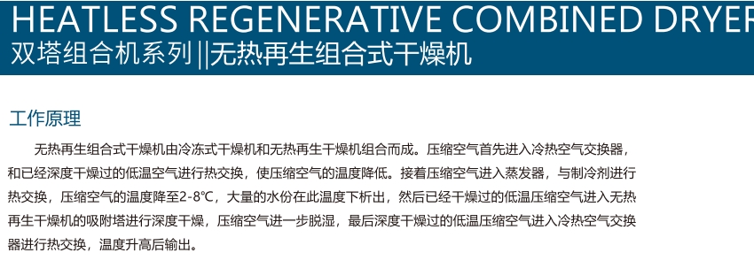 组合式干燥机 组合式干燥机是一种整合冷冻干燥与吸附干燥技术的工业压缩空气处理设备,该设备工作时,高温高湿压缩空气依次经换热器预冷、蒸发器深度降温析出液态水,再进入吸附筒进行除湿,干燥后的空气通过冷量回收升温,部分用于吸附剂再生以降低能耗。结构设计采用模块化连接,如双罐体分别实施冷冻与吸附干燥,通过管路切换控制工作模式,并配备密封圈、散热孔等组件保障运行稳定性