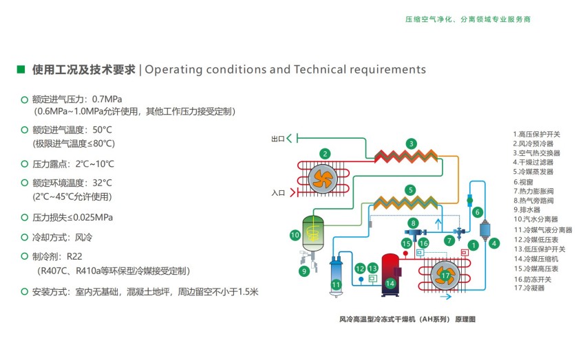 (12)冷干机动力控制部分有完善的保护措施。除压缩机本身提供的超温保护模块外,另加常规的电机过载保护和冷媒高、低压保护开关,并具备以下保护功能:电机过载、超温、缺相保护,以及冷媒压力过高与过低保护。