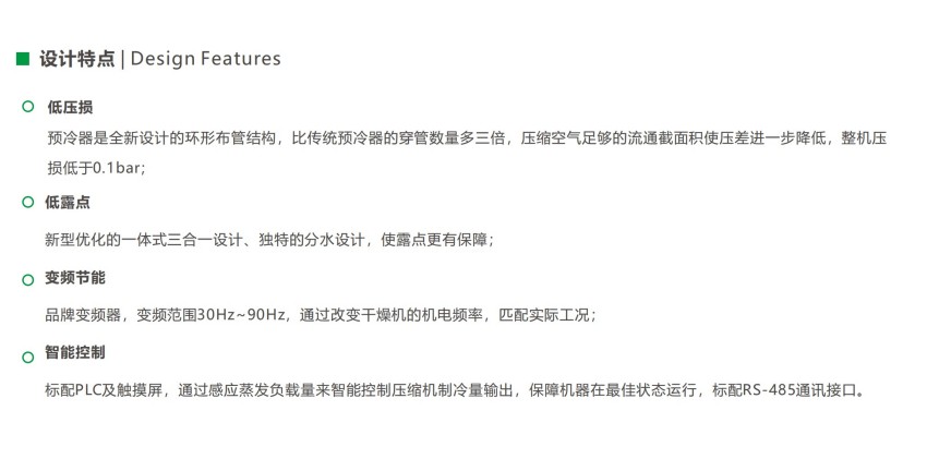 全新设计的集成分水器 ,能高效的进行汽液分离 ,使冷凝解析出来的水份完全分离配合304不锈钢丝网层叠进行过滤 ,得到干燥洁净的 压缩空气。
