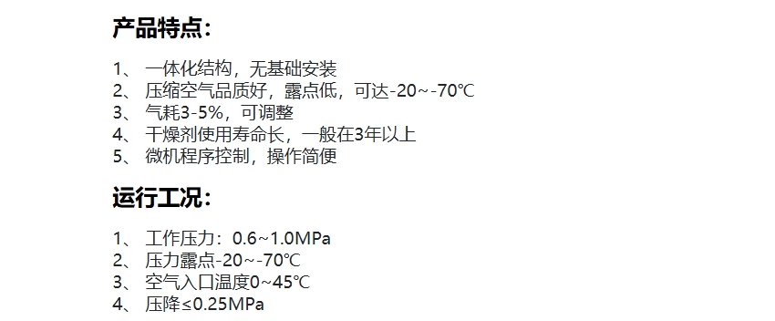 再生过程:干燥后的压缩空气温度较低,它进入换热器后,会冷却高温高湿的空气,同时自身温度也会有所升高。这一过程不仅防止了输送管路外的结露现象,而且升温后的压缩空气还可用于吸附剂的再生,提高了再生效率,并降低了能耗。