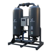 吸附式干燥机采用了高级的化工科技,其原理是将饱和之压缩空气,利用水份子和空气分子体积之不同,采用了气体净化专用之吸附剂(分子筛)来吸附压缩空气中的水蒸气。良好的吸附剂具有多孔性和大的比表面积,在高的水汽分压(加压下)气流中,吸附剂表面具有富集(吸附)水汽的性能,反之在低的水汽分压(减压下)气流中,已富集在吸附剂表面的水汽又会重新返回到气流中去,从而实现了连续吸附净化空气的目的。