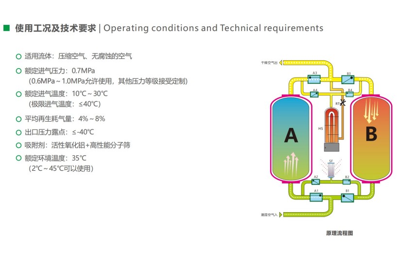 1、我们的吸干机应该安装在冷干机和过滤器的后端,因为吸干机对入口温度有要求,应在0~40℃之间,且不含液态水和油分。如果入口温度过高或含有液态水,会加大吸干机的工作负荷,导致干燥机在单位时间内压缩空气处理量降低,影响工作效率。