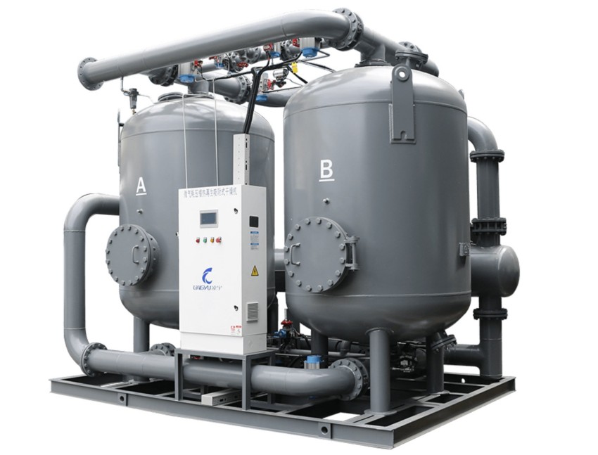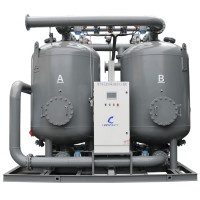 微气耗余热再生干燥器的工作原理是利用空压机排出的高温空气所具有的热量,对经过吸附过程的吸附剂直接加热升温,使 吸附剂得到彻底脱水再生;由于在加热再生过程时无耗气,吹冷过程仅消耗少量的成品压缩空气,所以大大的节约了能量。