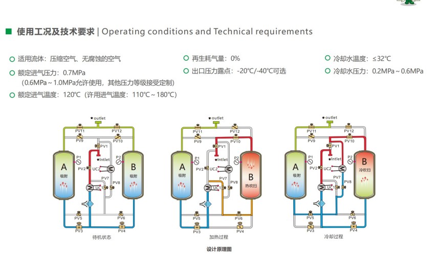 零气耗余热再生干燥器的工作原理是利用空压机排出的高温空气所具有的热量,对经过吸附过程的吸附剂直接加热升温,使吸附剂得到彻底脱水再生,吹冷过程使用经冷却器冷却过后的压缩空气,由于在加热再生及吹冷过程均无成品压缩空气消耗,所以最大程度地节约了能量。