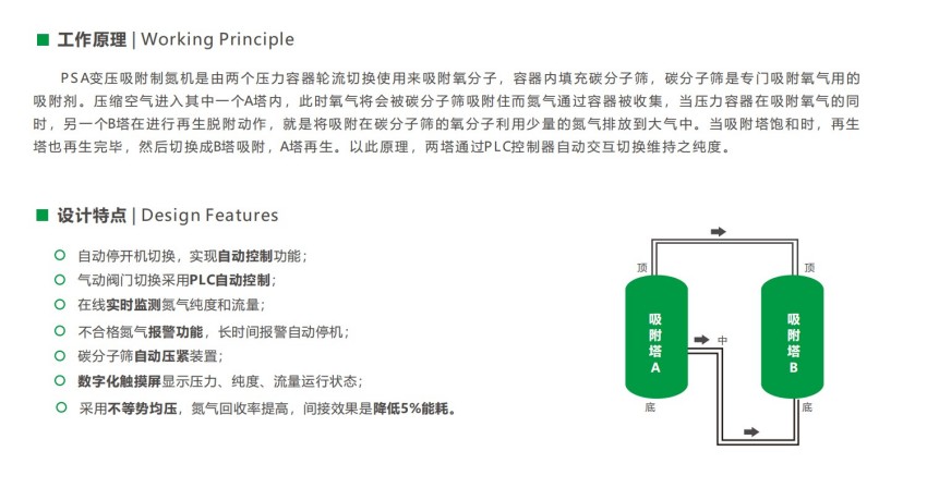 1.纯度调节:通过控制吸附周期(1-2分钟)和进气压力,可动态调节氮气纯度(95%-99.999%)。例如,降低产品气流量可提升纯度。