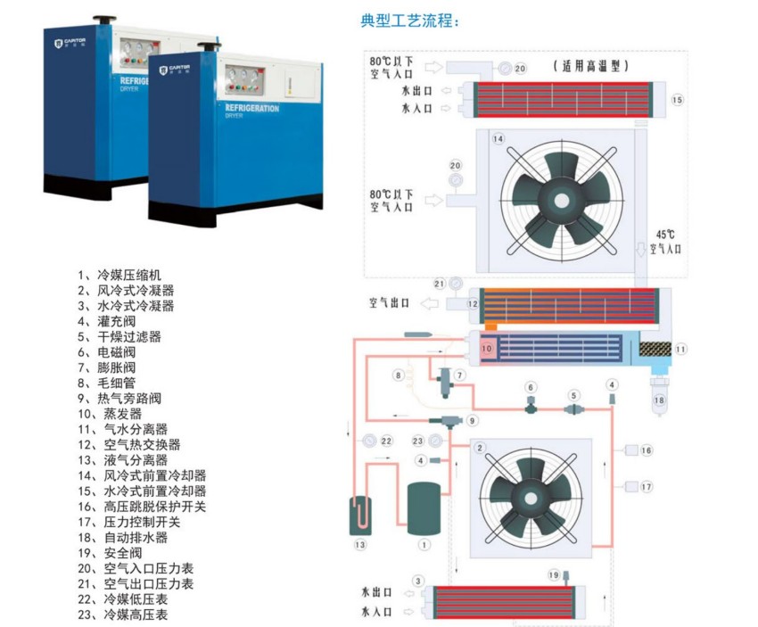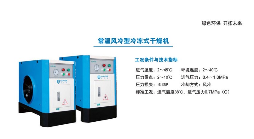 来自气源的压缩空气中含有大量液态水、粒径不等的固体粉尘及油污、油蒸汽等。如果这些杂质直接进入冷干机,将使冷干机工作状况恶化。例如油污会使预冷器及蒸发器里的换热铜管被污染,影响热交换;液态水则加大冷干机的工作负荷,固体杂质容易堵塞排水孔。所以一般要求在冷干机进气口上游装一支前置过滤器,用来作杂质过滤及油水分离用,以避免上述情况的发生。前置过滤器对固体杂质的过滤精度一般≤3.0微米,冷干机的后置过滤器:如一般动力用气,需配一支精度较高的主管路过滤器。在用气要求更高的时候,应配置相应的除油雾过滤器或活性碳过滤器。