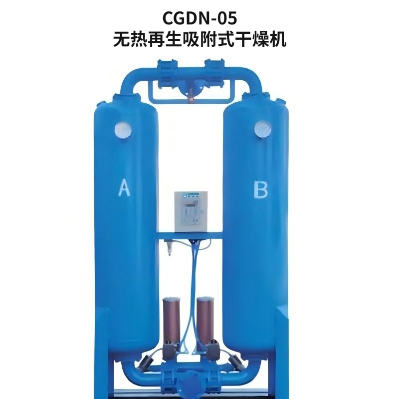 无热再生吸附式干燥机是利用变压吸附的原理,干燥剂在管网压力下吸附压缩空气中水份,然后再切换到大气压力下脱附,从吸附塔出口回引一部分干燥空气,对干燥剂进行脱水再生,一塔吸附水份,一塔解吸再生,双塔交替进行,连续循环工作,不间断向用气点提供干燥、洁净的压缩空气。
