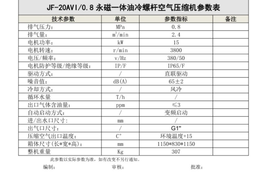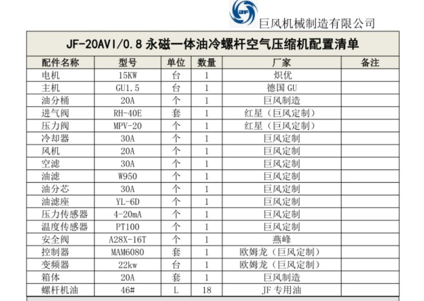 巨风JF-20AVI永磁变频油冷空压机技术参数: