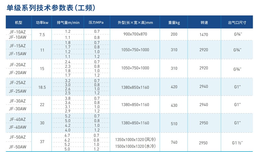 提供巨风JF-25AZ/JF-25AW螺杆式空压机,该型号包含JF-25AZ/12、JF-25AZ/10、JF-25AZ/0.8、JF-25AZ/0.7,水冷型包含JF-25AW/12、JF-25AW/10、JF-25AW/0.8、JF-25AW/0.7,主机质保5年,整机一年。
