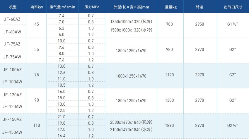 提供巨风JF-175AZ/JF-175AW螺杆式空压机,该型号包含JF-175AZ/12、JF-175AZ/10、JF-175AZ/0.8、JF-175AZ/0.7,水冷型包含JF-175AW/12、JF-175AW/10、JF-175AW/0.8、JF-175AW/0.7,主机质保5年,整机一年。