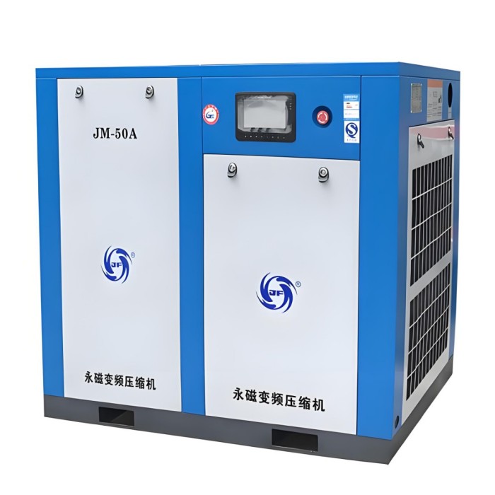 提供JM-50A/JM-50AV/JM-50AZ永磁变频螺杆空压机,功率为37KW,排气量约为5.0-6.7m³/min,压力0.7-1.2MPa,该机型是由巨风动力生产制造的单级压缩永磁变频系列,欢迎前来咨询。