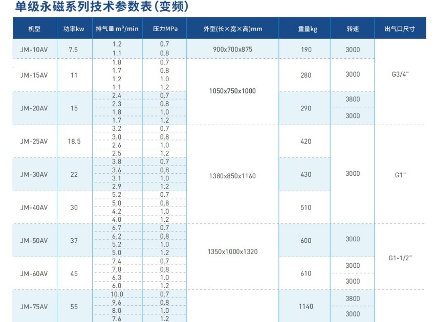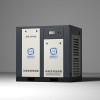 提供JM-100A/JM-100AV/JM-100AZ永磁变频螺杆空压机,功率为75KW,排气量约为10.5-13m³/min,压力0.7-1.2MPa,该机型是由巨风动力生产制造的单级压缩永磁变频系列,欢迎前来咨询。
