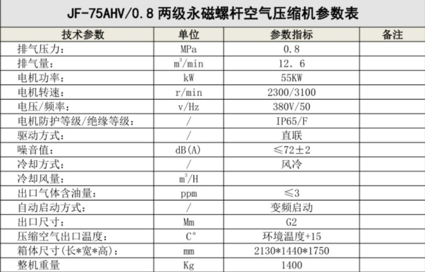 巨风JF-75AHV两级压缩永磁变频空压机技术参数及配置表: