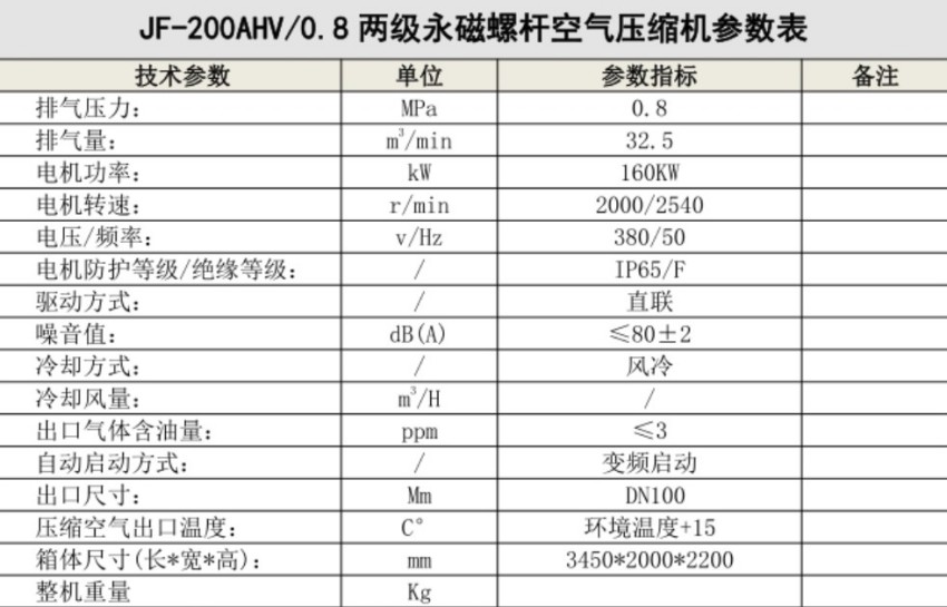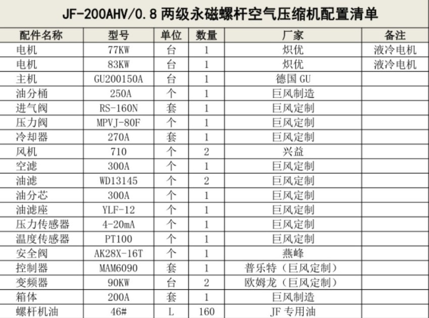 巨风JF-200AHV两级压缩永磁变频空压机技术参数及配置表: