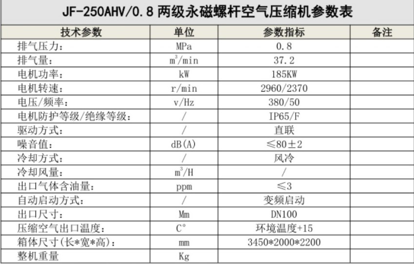 巨风JF-250AHV两级压缩永磁变频空压机技术参数及配置表: