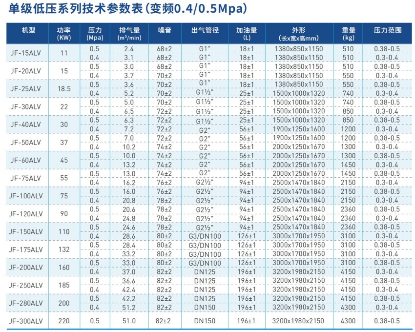 供应巨风JF-40ALV单级低压变频螺杆空压机,排气压力0.3-0.5MPa,排气量为6.3m³-7.5m³/min,型号包含JF-40ALV/0.3、JF-40ALV/0.4、JF-40ALV/0.5等,具有运行稳定、噪音低、结构紧凑、运行稳定特点,欢迎前来咨询。